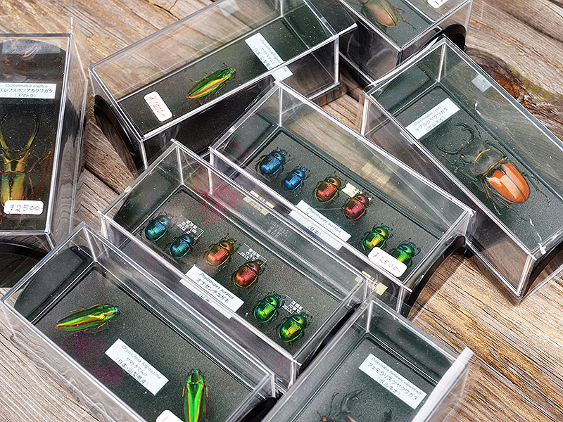 ボルネオ産やパプアニューギニア産のクワガタやホウセキゾウムシをはじめ、日本産のオーセンチコガネなど、昆虫好きの方にはたまらないコレクションです。