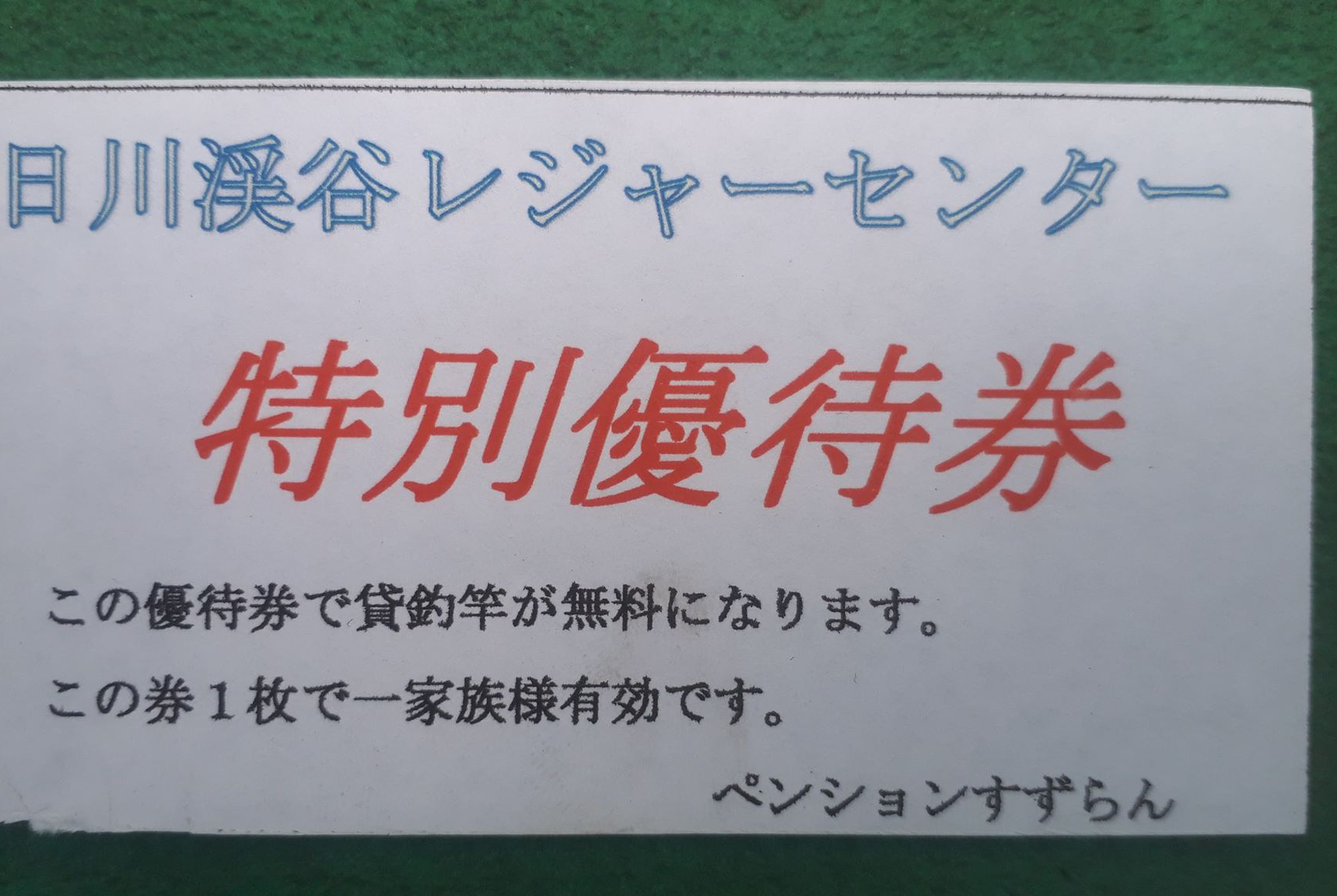 このレジャーセンターで帰りに釣りをして見ようとお考えの方はフロントまでお申し付け下さい。特別優待券を差し上げます。この券で貸出用の竿代が無料になります!