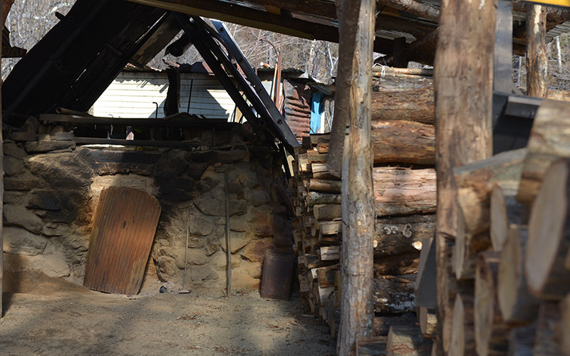 写真左奥が炭焼き窯。この写真撮影時は焼いた窯を少しずつ冷やすために丸3日間そのままにします。