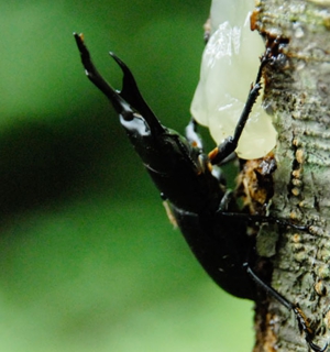 ▲樹液に集まるミヤマクワガタとルリボシカミキリ